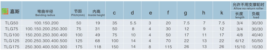 TLG steel drag chain can bearing number, weight of cable and tubing, free suspended large, supporting wheel (allowed) and support plate can depend on customer needs to make, suitable for machine tools, mobile machinery. The bending radius of 50-600 - mm, chain plate height is 35-150 - mm, can be used freely. TLG steel drag chain system to use the trip up to 32 m. Apply to all transmission ways. Can be shorten and lengthen. In addition, the bending radius can be obtained by changing the pin change. Drag chain support plate width is 150 mm to 600 mm, the gap between the hole and the hole is 5 mm. The height of the chain plate, that is, the height of the support plate, is determined by the maximum diameter of cable, machine tool operation, the maximum as the width of the drag chain of more than 300 mm, the length of the drag chain for stability reasons, when more than 4 m should consider to choose a bigger dress size specifications of the drag chain. Want to choose according to the diameter of the cable bending radius and should achieve 10 times the diameter of the cable. Bending radius can be according to the choice of 50-600 - mm, given small can choose a smaller radius corresponding. Drag chain length = ? travel + 4 bending radius, this is only applicable to when a fixed link is at the point of the journey. Drag chain fixed according to the position of the machine tool of choice. Fixed Angle can be on the outside or inside of the drag chain of internal or external, usually connecting part within the drag chain, and to the peripheral.