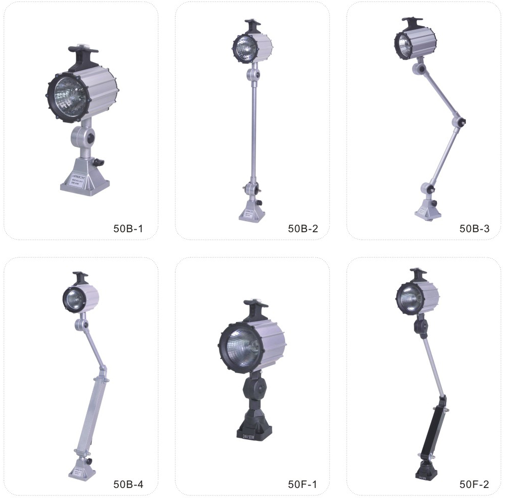 JS.109002 50B??50F series work light 50 B-1 working lamp adopt halogen tungsten lamp of new light source, the light is downy, concentrated sex good, use the small and medium sized machine tools, CNC machine tools, drilling and milling machine, combination machine tools and other equipment, lighting, and has the advantages of waterproof, explosion-proof, prevent erosion. 50 B - 2 are suitable for all kinds of machine tools, CNC machine tools and special machine tools with positioning lighting, at the same time have the characteristics of the above. 50 B - 3, 4, medium-sized machine is suitable for various lighting for long distances, respectively,have the characteristics of the above.